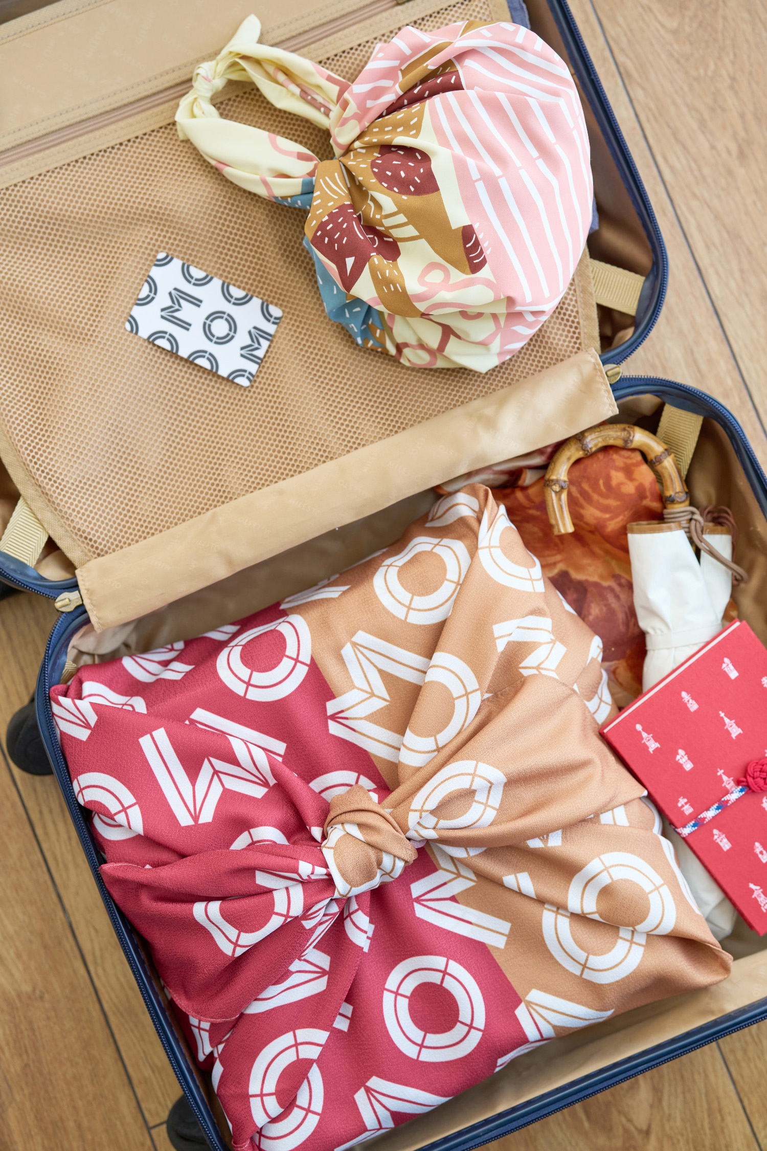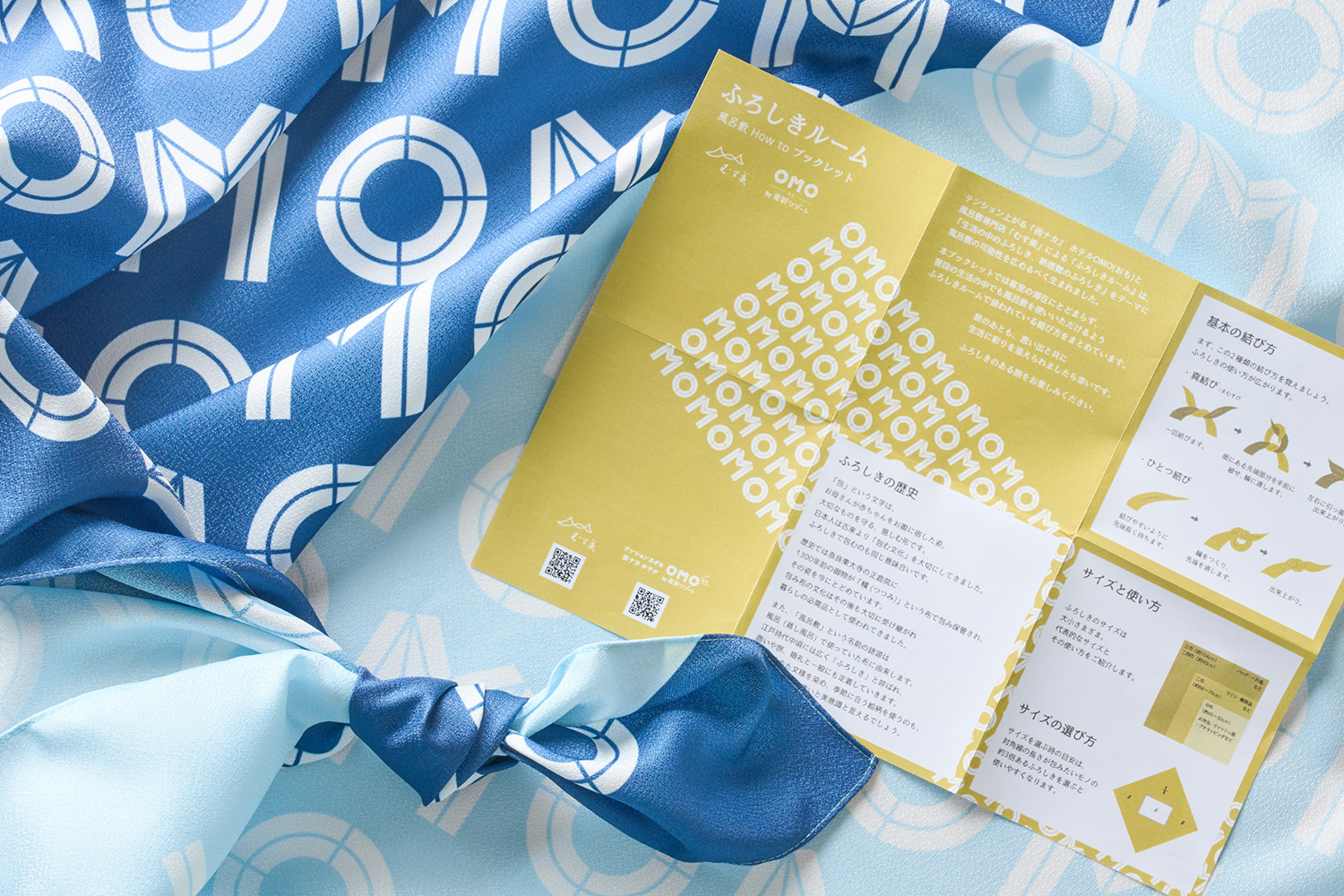 100cmサイズは、エコバッグ・衣類収納・お土産ラッピングなど「旅」をテーマとした提案をしていただけます。ふろしきの使い方を掲載したOMOオリジナルリーフレットを添えることで、ゲストが滞在中に楽しみながら活用できるよう工夫しています。