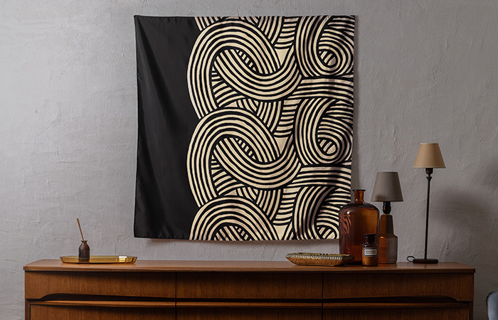 長年高い人気を得ている両面染めと、撥水加工を掛け合わせた他に類を見ない技術でつくった商品です。 伊砂文様を大きく余白を意識したデザイン、シックなカラーリングで、和洋の領域を超えたアート感漂う一枚です。